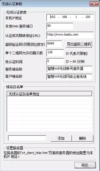 F、无线认证白名单地址:既不需要认证就可以访问的域名地址,在文本框输入域名地址后点击“添加”即可。注:微信扫描必须需先添加微信域名白名单(wx.qq.com;weixin.qq.com;qlogo.cn;qpic.cn)。