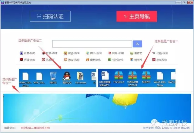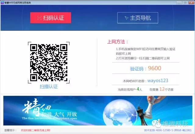 扫码认证页面:有二维码、上网方法、验证码、无线名称和上网人数统计及广告位一的广告。