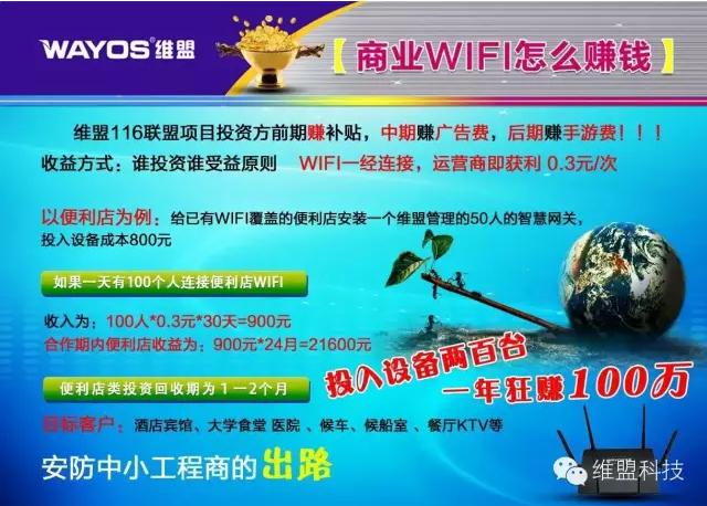 维盟科技推出的116WiFi联盟现在将这一设想实现了!真正躺着赚钱,客户、商家双赢的营销平台!