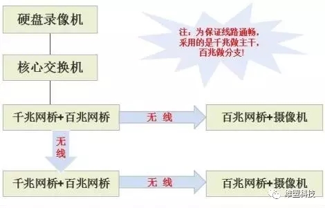 综合矿山实际情况,此次网络监控采用一台核心千兆口交换作链路主控制,通过千兆网桥做无线主干(做三次中转)传输,百兆网桥做分支,保证了摄像机随时移动,视频的清晰流畅。