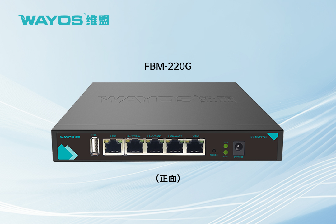 FBM-220G多WAN防火墙路由器,是维盟科技针对中小型企业、网吧、出租屋而设计的突出上网行为管理、带宽叠加、智能QoS、SD-WAN组网、集成PPPoE认证服务器的多功能防火墙路由器。具备4个广域网接口,最大支持80台终端同时在线。支持全新的AI盟友管理,其领先的QoS带宽管理功能,只需要设置好实际带宽,就可以轻松解决各种P2P程序占用网络带宽的问题,保证网络快速、流畅。